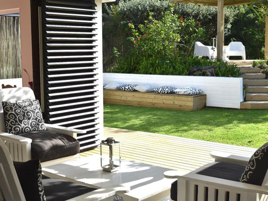 - White deck chairs seating 4 pax (one double seater, two single seaters) with coffee table