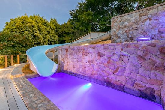 - Pool deck with sun loungers, beanbags and a water slide leading to 2nd pool