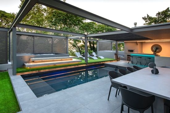 The lounge area has beautiful contemporary-chic décor in monochromatic tones, large flat-screen television, and a state-of-the-art sound system and has access to a guest bathroom and a small serenity garden at the back of the villa. The dining area features an elegant 10-seater dining table and flows out onto a spacious garden deck with an outdoor entertaining area.
