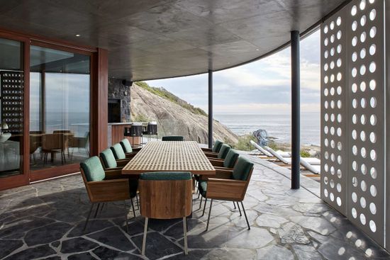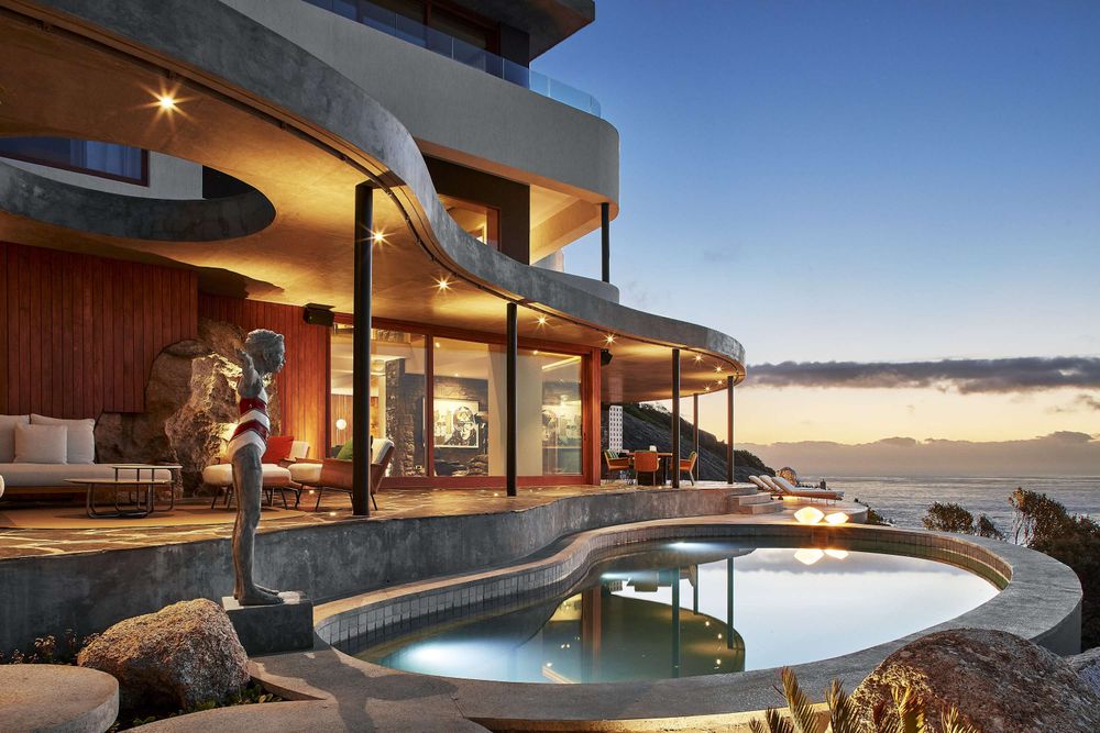 Set atop the ancient boulders that border secluded Llandudno beach, Zen Charm introduces a refreshing vision for the classic beach house escape. Undulating concrete levels support monolithic glass walls; the architecture evokes both the nearby shoreline and the surrounding mountains. As the residence descends the cliffside onto the beach, each floor offers panoramic views of the Atlantic, culminating in a generous slate alfresco terrace with steps down to the ocean. Its five bedrooms, all with generous en suites, are designed to provide absolute privacy.